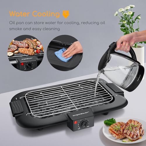 【Práctico】El diseño de la bandeja recoge grasa es multifunción, ya que añadiendo agua disipa el calor, evita que las manchas se queden adheridas y reduce el humo para el uso en interiores; además, es totalmente desmontable para una cómoda limpieza y almacenamiento.