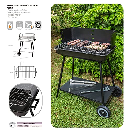 Una práctica barbacoa con 2 ruedas y asa para que puedas moverla con facilidad, de diseño rectangular, para usar con carbón, perfecta para el jardín, la terraza o llevártela de campamento.