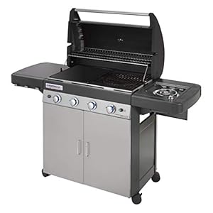 Alta calidad y potente: 4 quemadores de tubo de acero inoxidable de alto rendimiento (12.8 kW) + 1 asador lateral (2.1 kW); parrilla con confiable encendido Piezo para un sencillo encendido