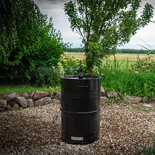El barril de barbacoa BRENNA combina 5 funciones: asar a la parrilla, ahumar, hacer hogueras, fumador y hornear pizzas.