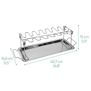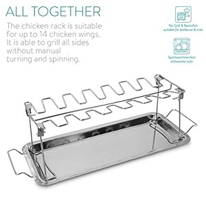 GRAN ESPACIO: La rejilla para pollo es adecuada para la preparación simultánea de hasta 12 alitas o pinchos. Con esta base de chicken wings, evitarás que tus pedazos de pollo se quemen y no tendrás que luchar para darles la vuelta.